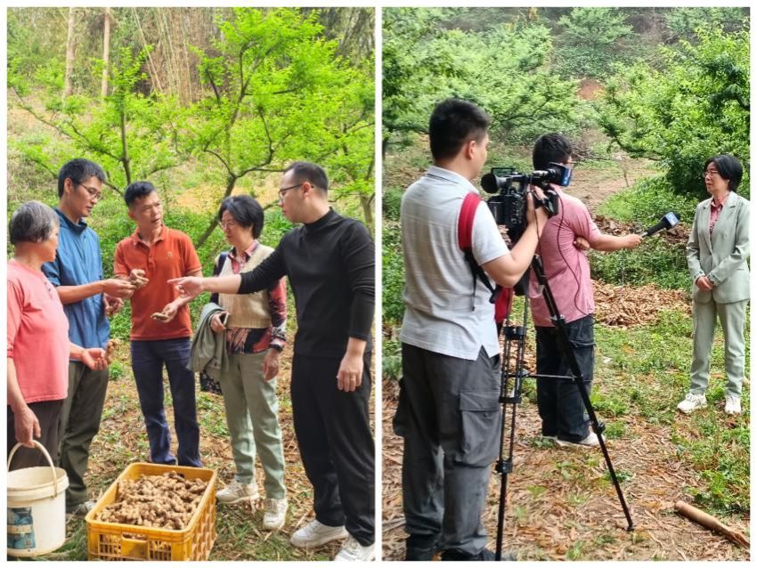 在波罗镇板水村三华李林下套种小黄姜基地,特派员团队开展现场指导。三华李方面,指导农户开展绿色防控、强化保果措施。小黄姜方面,针对姜瘟病、炭疽病防治难点,讲解关键防控技术:姜瘟病预防为主,种姜消毒、连茬土壤熏蒸,发现病株连根带土剜除并用生石灰消毒病穴;炭疽病抓住雨季前后关键期防控。增施腐熟有机肥,控氮、增施磷钾肥和硅钙肥,提高抗病性。技术手把手教给农户。期间,英德市电视台于3月27日对两支科技特派员团队的队长余晓华和陈国健进行了现场采访。