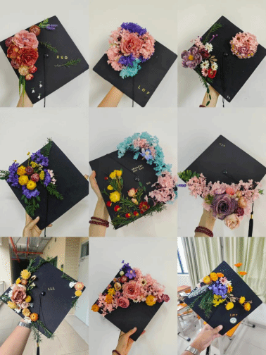 活动伊始,园艺211班罗逸萱同学给同学们介绍了簪花学位帽的制作方法,并结合所学专业知识让同学们了解到园艺疗法对于促进心理健康的重要作用。随后,同学们以帽为“纸”,以花为“笔”,将朴素的学士帽点缀得五彩斑斓,一顶顶独一无二、“帽”美如花的学位帽展现在大家面前。