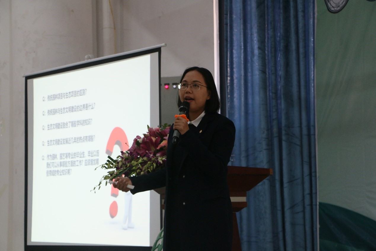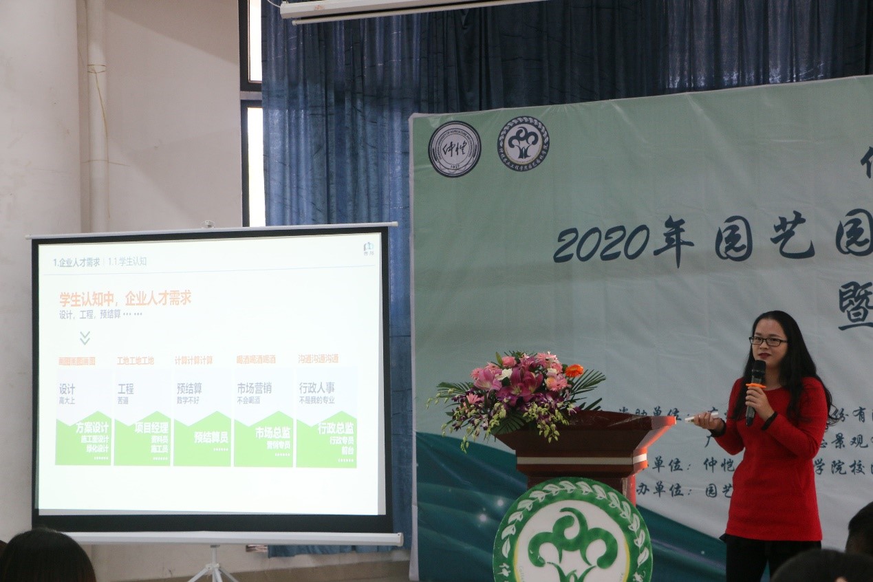 李银经理从大型园林企业人才需求角度,引发同学们的思考,深入为同学们讲解园林专业的岗位需求与人才培养目标。她指出学生对外与对内认知的偏差,建议加深对岗位的了解,根据追求目标进行自我培养。她为同学们介绍了广泛的企业人才需求、详细的园林职业类别、薪酬结构构成以及企业的人才选择标准。她通过“生态所的困扰”一问,引出“NLP人才层次”概念,说明“理解层次越高的人,解决问题的能力也就越强,就越是我们社会需要的人才”。在讲座后的现场提问环节,同学们踊跃提问,两位嘉宾耐心为同学们解答疑惑。